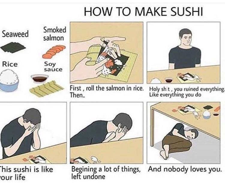 Sad sushi meme. Thanks to these sweet illustrations it is much easier to be there for the melancholics. See more ideas about sushi sushi art sushi love. Just follow the simple 10 step guide and you ll soon have your sad little subject wrapped up like a warm and happy sushi roll. Select a rating select a rating. Mar 23 2016 everything created in fun and with humor using sushi. Write a review for kanzi sushi hibachi restaurant. By sugarbear 2015 09 04 19 00.